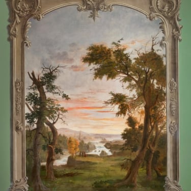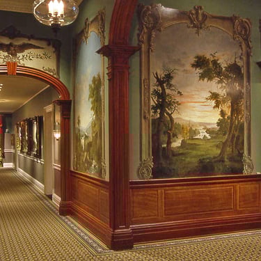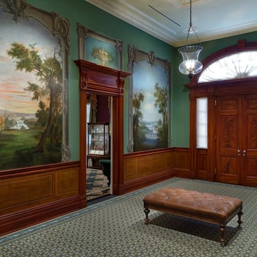 Duncanson's progress as a landscape painter in 1850s caught the attention of Longworth a major landowner and wine maker, who was one of the wealthiest men in the United States and largest arts patron in Cincinnati. Longworth, a taciturn man in political affairs, was known tp possess strict antislavery principles. One story often told Longworth hid a runaway slave, Harvey Jones, in his cellar and paid his Kentucky master to set the man free. In the young African-American artist, he could support both his cultural philanthropy and abolitionist sentiments. Motivated by his abolitionist sympathies and Duncanson's experience as a house painter and decorator Longworth commissioned Duncanson to paint large landscape murals in his house for his 50th wedding anniversary to his wife Comtesse Clara around 1850. The commission was the largest project of Duncanson's career, consisting of Eight huge landscape decorations approximately nine by seven feet, three over-the-door floral vignettes and two patriotic eagles over arched entrances. Longworth's support usually consisted of funds to send an artist east or to Europe to study. Duncanson traveled to Europe April 1853 to January 1854. In a letter to a friend in Italy Longworth wrote " One of our most promising painter is a light mulatto by the name of Duncanson . He is a man of great industry and worth." After Longworth's death in 1863 his son Joseph sold the house to David Stinton who had the murals wallpapered over. In 1927 the house was donationed to the city of Cincinnati. During a renovation of the building in 1931 the wallpaper was removed,.