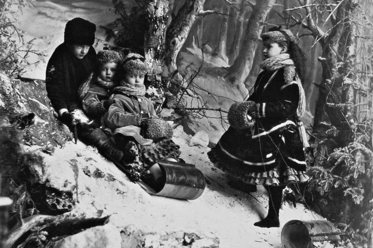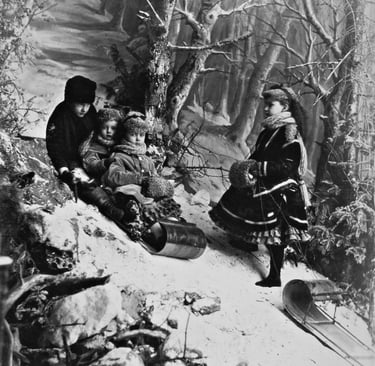 Robert Duncanson meet William Notman ( 1821-1891) Canada’s best Photographer in 1863. Duncanson sat up a art school teaching Hudson River style of painting & helped paint backgrounds in Notman’s studio. Notman had over 50 Employees and said his work was so good because he hired the best. He had patents for his fake snow and ice effects in his studio. The image of the children tobogganing was taken in his studio. He is credited with inventing the Halftone printing technic. The McCord museum has over 450,000 images. Notman was the photographer of the queen.